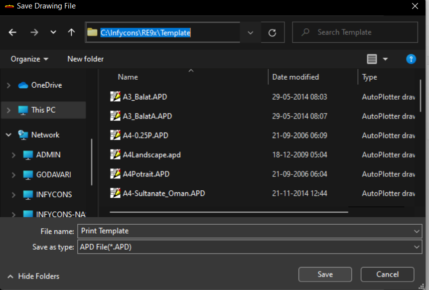 Save the template in APD file(*.APD) format in C:\Infycons\RE9x\Template folder