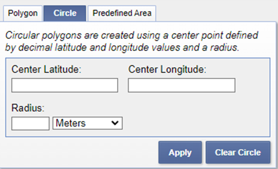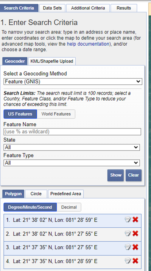 Polygon: Zoom to the area of interest and click on Use Map to select the complete displayed area.