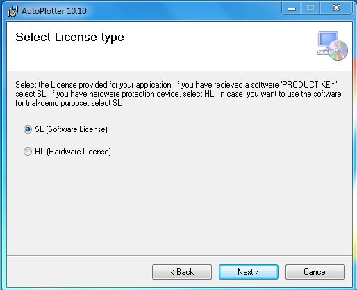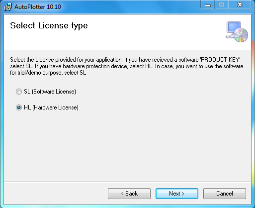 5. Then choose the License type SL (Software License) if you are having 'Product Key' or HL (Hardware License) if you are having dongle. Continue by pressing Next button.
