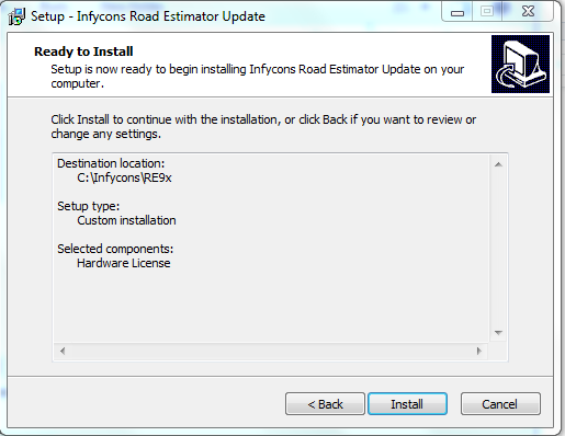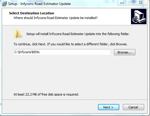 10. The installation location can be set as per the requirement. The default directory is C:\Program Files\Infycons\RE9. Select the appropriate folder where you want to install Road Estimator and continue by clicking the Next button.